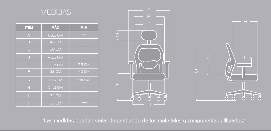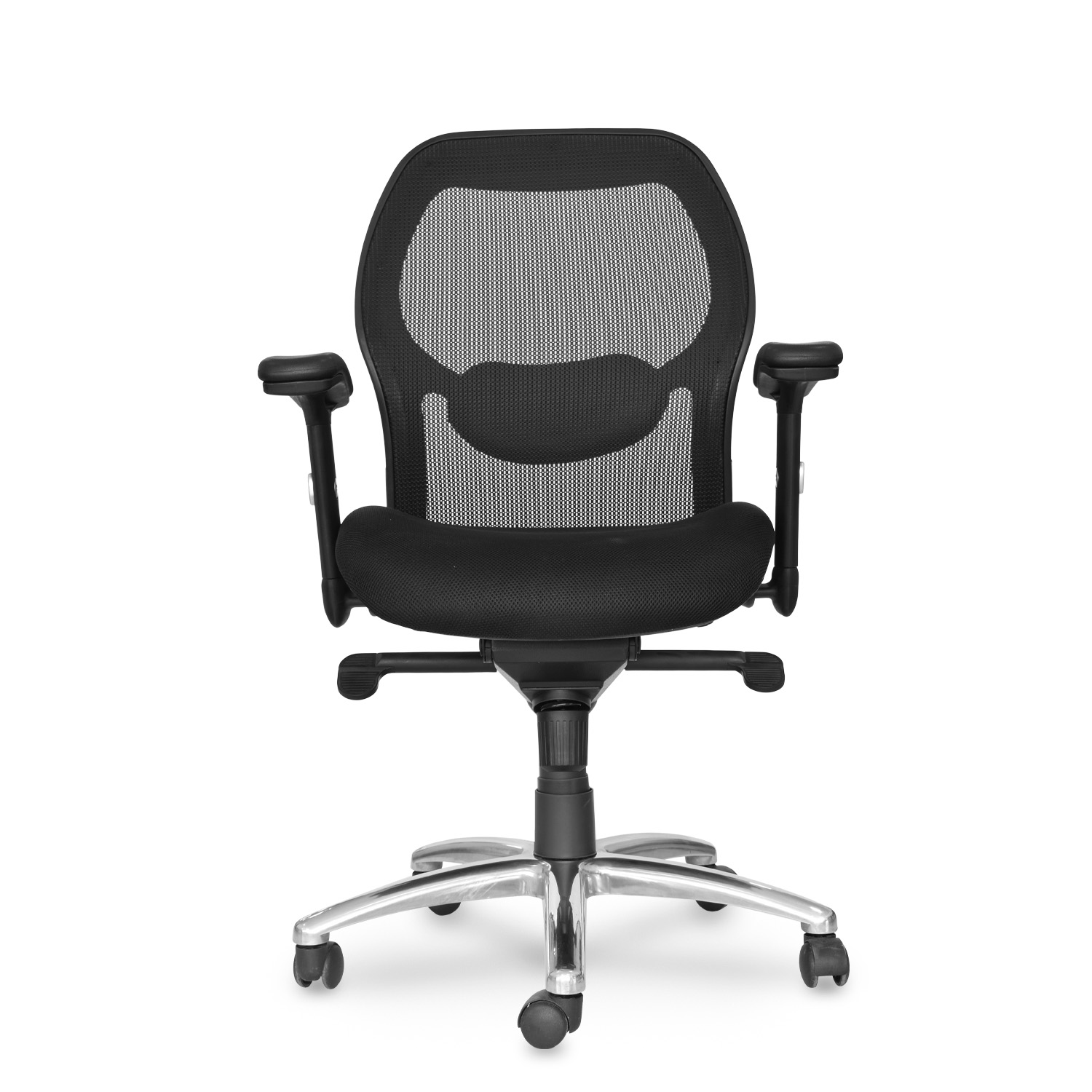 Silla giratoria con opción de cabecero tapizado regulable en altura y ángulo, espaldar en malla con apoyo lumbar tapizado regulable en altura y profundidad, brazos 2D regulables en altura y con extensión lateral con PAD en PU, asiento de espuma laminada con tapizado textil y plastic seat, mecanismo syncro 4 bloqueos antishock y perilla de tensión, base en aluminio 320 mm, ruedas en nylon 50 mm / Color: Negro / Garantía: 1 año